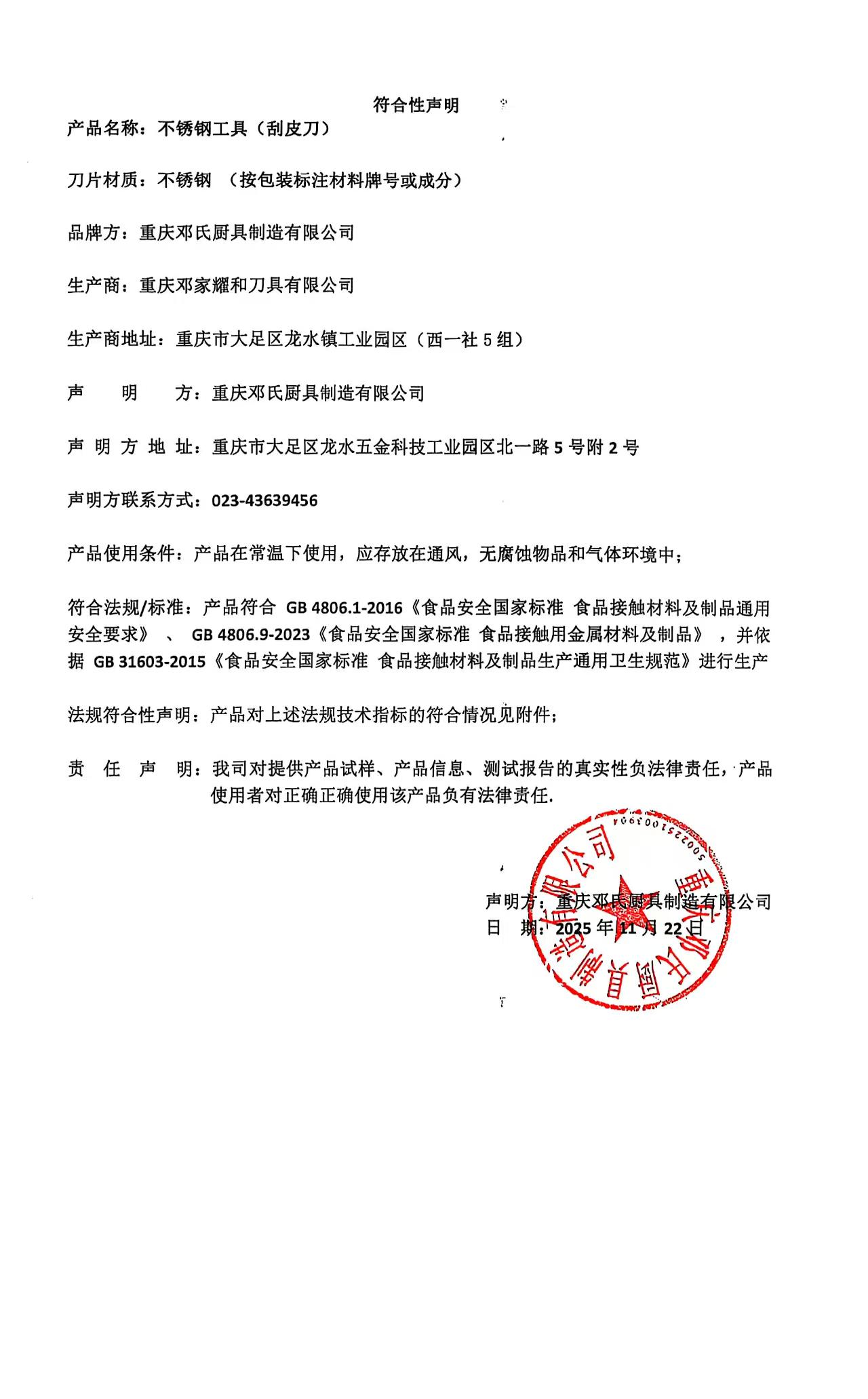 邓家刀刮皮刀产品符合性声明